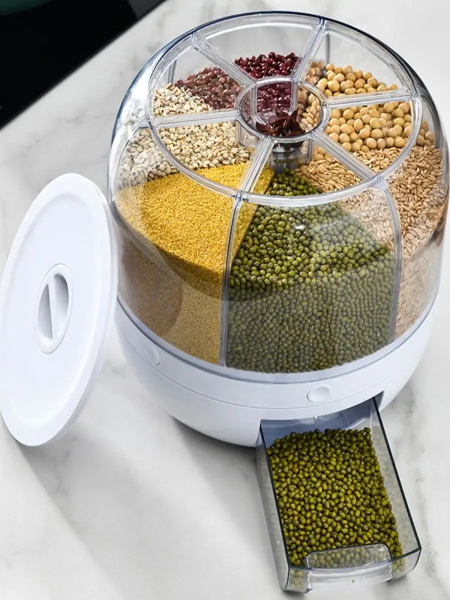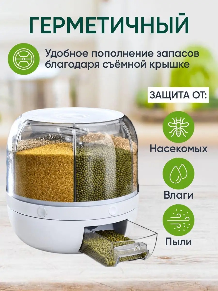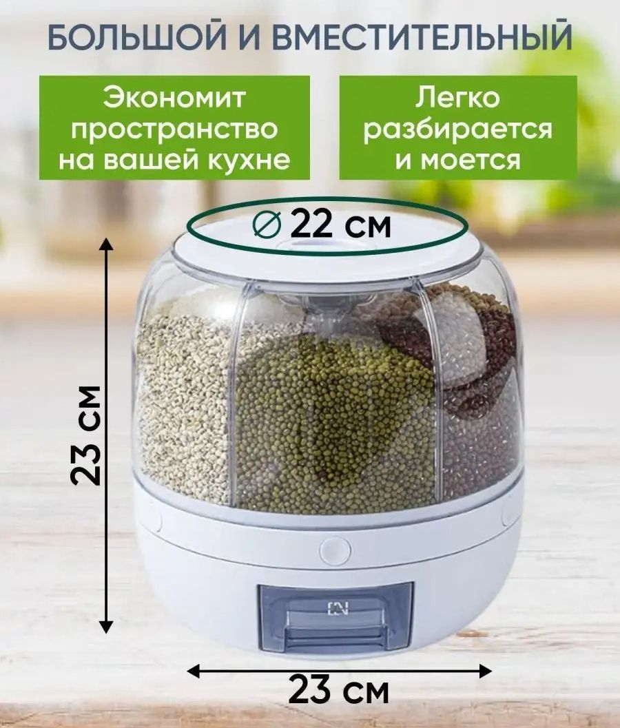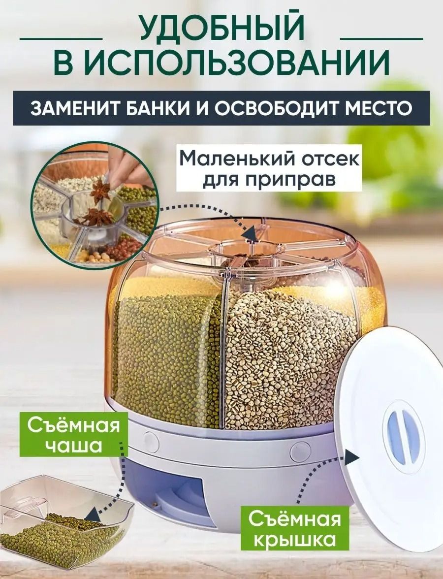 Диспенсер с шестью вместительными отсеками поможет в организации хранения сыпучих продуктов на вашей кухне