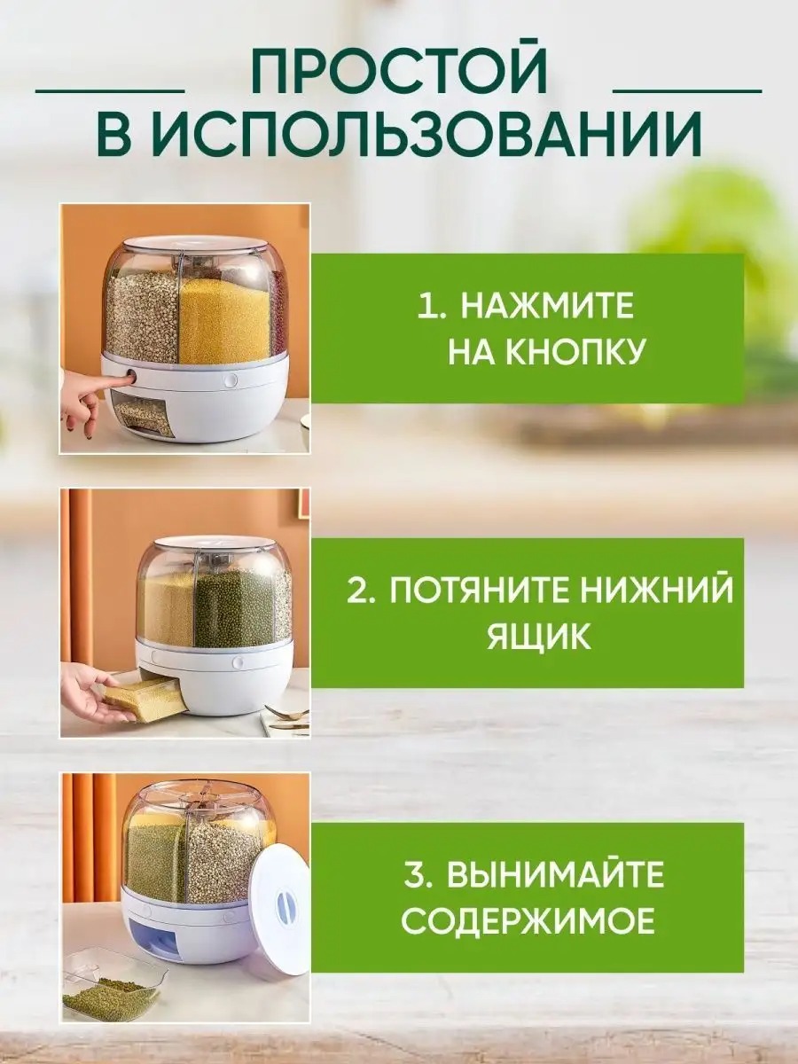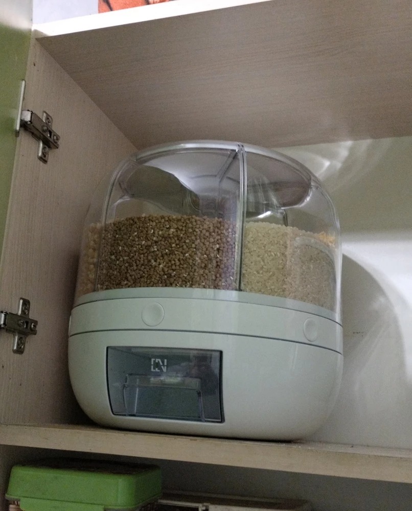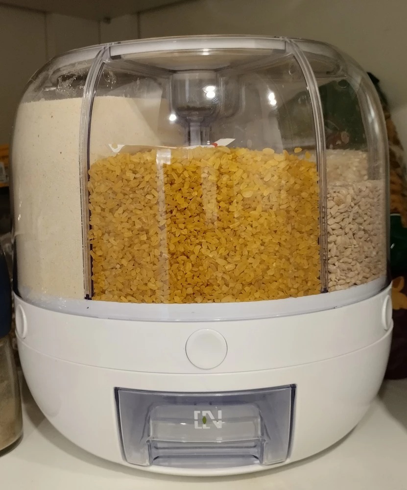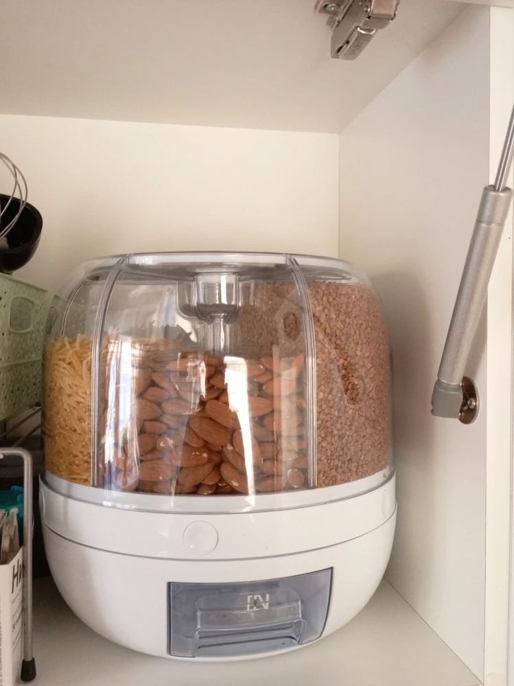 Клёвая штукенция! Весь бардак спрятала в одном месте 😄Всё работает, засыпается и ровненько высыпается, крутится отлично, кнопки не тупые. В один отсек вмещается упаковка манки 900 гр. и остаётся ещё места где то на пол упаковки. Вермишель (паутинка) влезло 2 пакета по 400 гр.